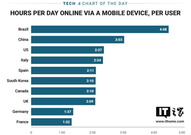 隨著(zhù)智能手機技術(shù)的快速發(fā)展,人們對于智能手機的依賴(lài)程度也越來(lái)越高。近日市場(chǎng)研究公司Statista公布了一組統計數據,數據顯示的是去年各國用戶(hù)平均每天使用智能手機的時(shí)間。從這份數據中可以看到,很多國家的用戶(hù)每天停留在智能手機上的時(shí)間都超過(guò)了一個(gè)小時(shí)。