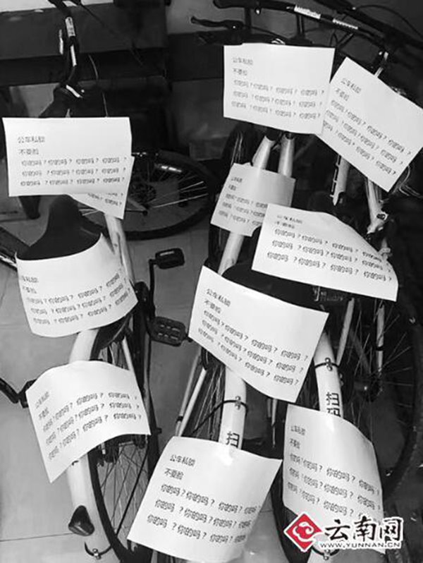 有市民爆料,位于麗江市區太和西路的廣源商廈內,停放的3輛小黃車(chē)被上私鎖后,不知何人打印了10余張“你的嗎?”的質(zhì)問(wèn)紙條。